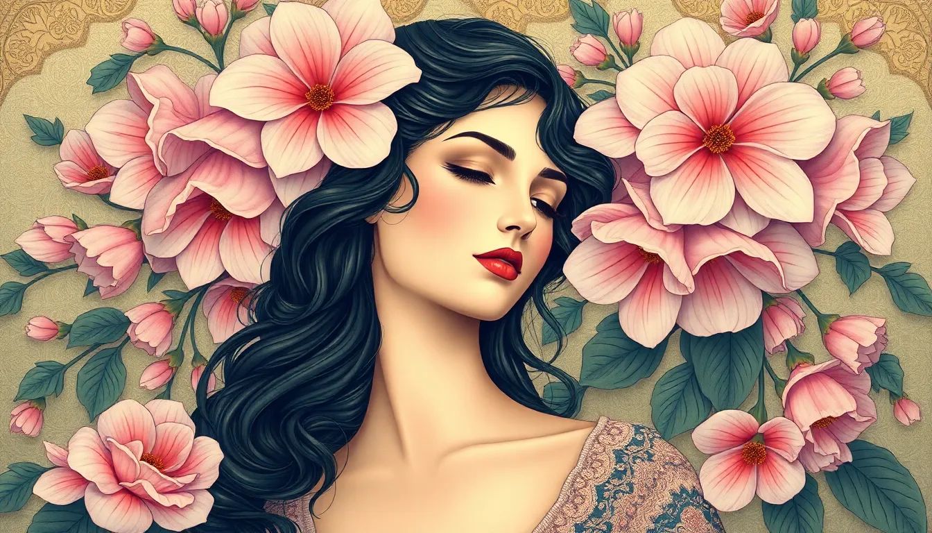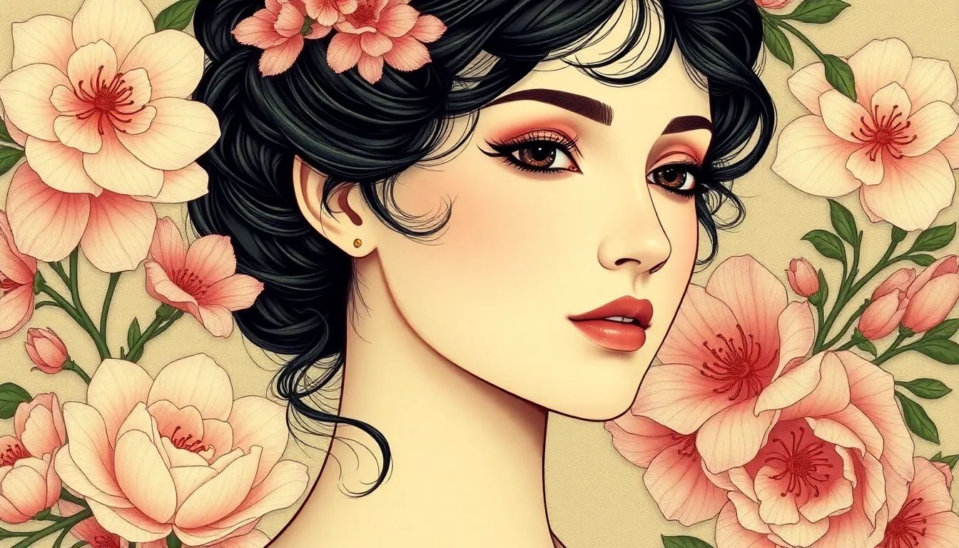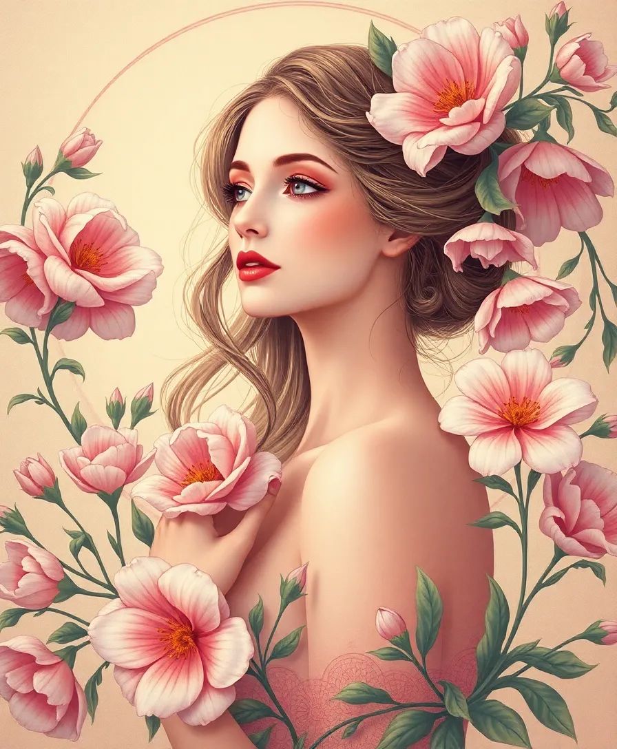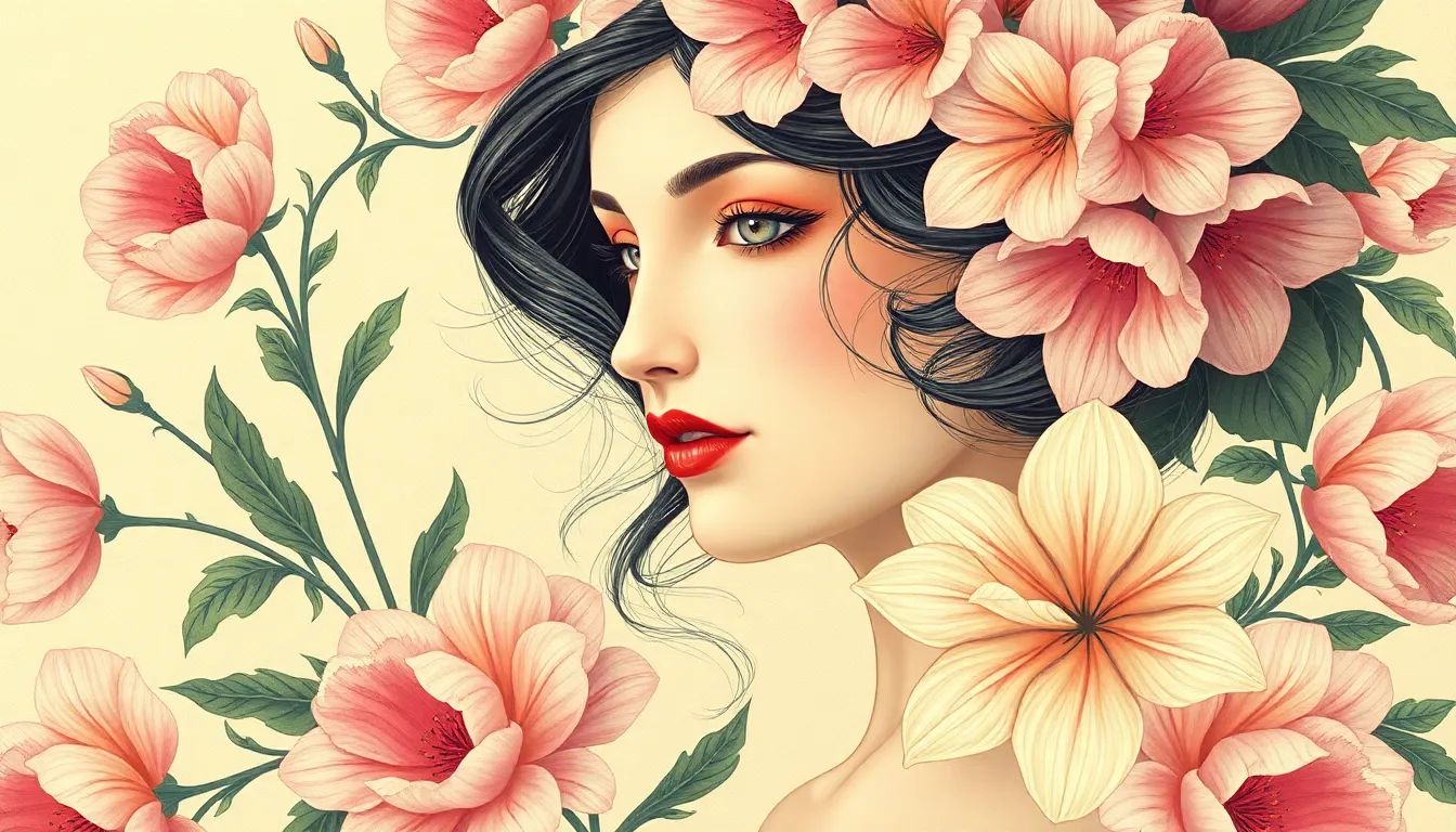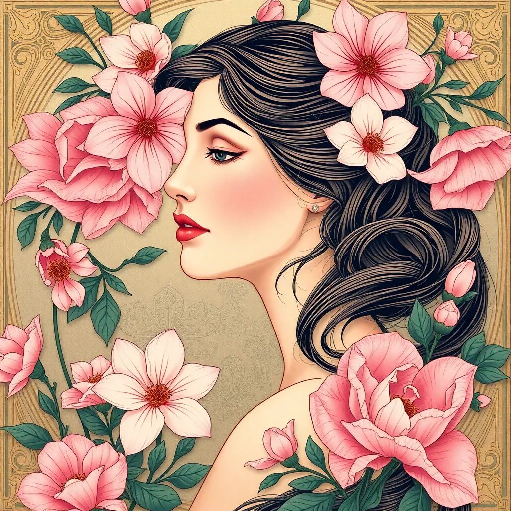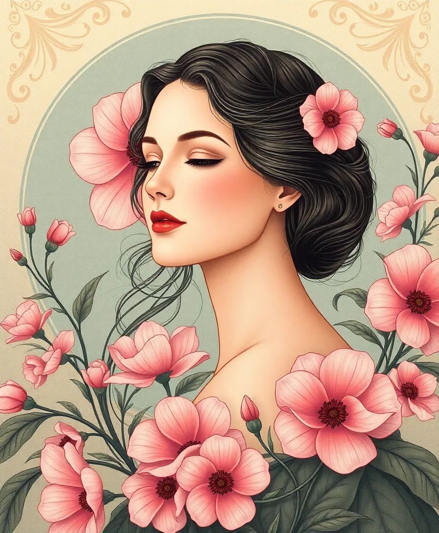 Art Nouveau portrait of a graceful woman surrounded by blooming flowers, organic flowing lines, soft lighting, pastel tones, vintage European art style, highly detailed, ornamental design, 8K resolution